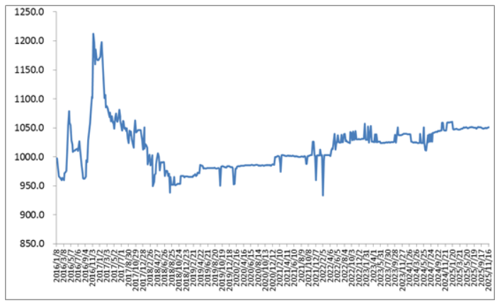 本周(2025年11月17日-2025年11月21日),由中国物流与采购联合会和林安物流集团联合调查的中国公路物流运价指数为1050.75点,比上周回升0.01%。