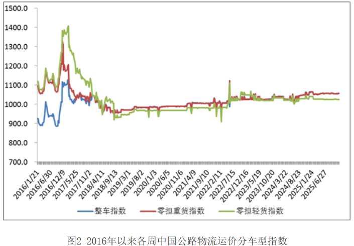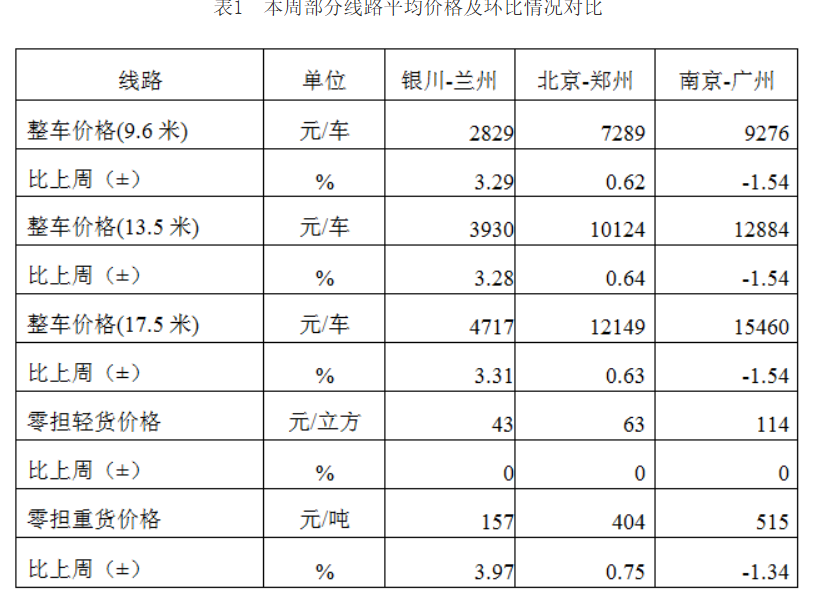 分车型看,各车型指数环比涨跌互现。其中,整车指数为1056.79点,比上周回升0.03%;零担轻货指数为1025.27点,比上周回落0.01%;零担重货指数为1056.53点,比上周回落0.05%。