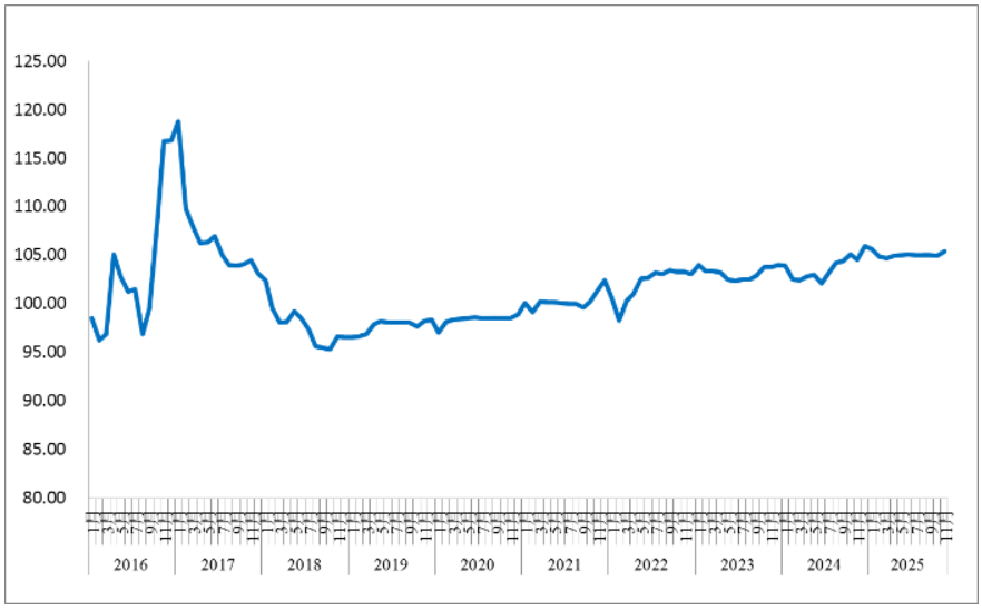 2025年11月份,由中国物流与采购联合会和林安物流集团联合调查的中国公路物流运价指数为105.4点,环比回升0.46%,同比去年回升0.82%。从月内看,本月各周运价指数环比均有所回升。