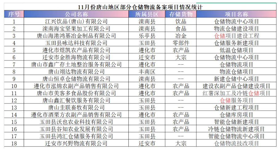 据不完全统计,11月份共涉及 18个仓储相关项目,覆盖唐山市多个县区,项目类型涵盖物流中心、冷链仓储、智能仓储、技改项目等。通过对10月份与11月份唐山地区新备案仓储物流项目数据进行整理与对比,主要从项目数量、区域分布、存储货物类型、项目名称特征等方面进行分析,如下: