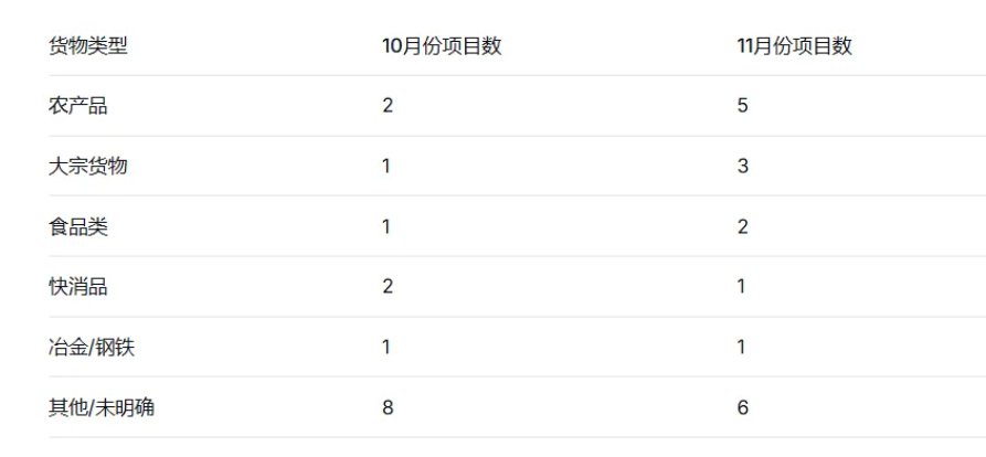 农产品仓储项目增长明显:从10月份的2个增至11月份的5个,反映农产品冷链、仓储需求提升。
