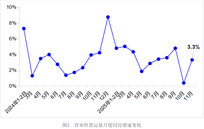 11月,完成营业性货运量52.6亿吨,同比增长3.3%。其中,完成公路货运量38.8亿吨,同比增长3.6%;完成水路货运量9.2亿吨,同比增长3.3%。