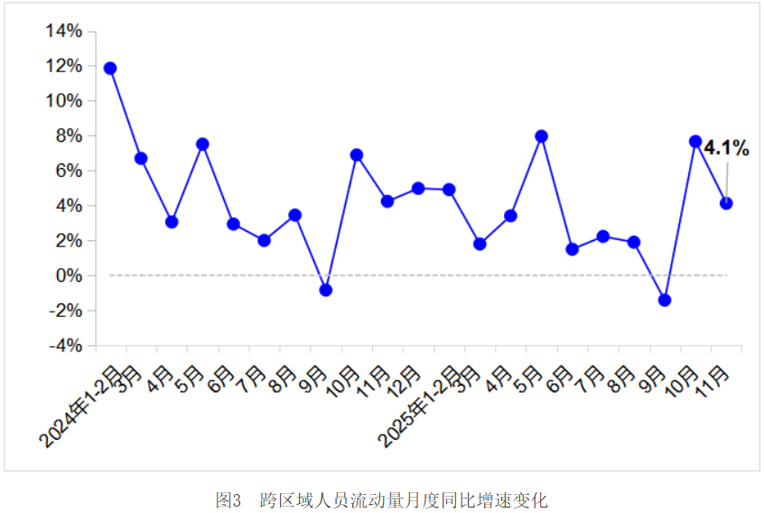 11月,完成跨区域人员流动量49.9亿人次,同比增长4.1%。其中,完成公路人员流动量45.8亿人次,同比增长3.7%;完成水路客运量1783万人次,同比增长9.4%。