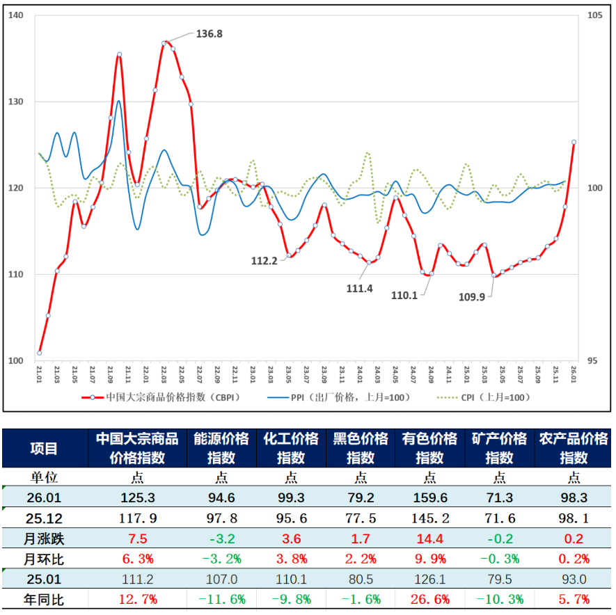 由中物联大宗商品流通分会和上海钢联等单位联合调查,中国物流与采购联合会发布的2026年1月份中国大宗商品价格指数(CBPI)为125.3点,环比上涨6.3%,同比上涨12.7%,创2022年7月以来新高。从指数运行情况来看,一方面,随“两重”“两新”政策加力扩围,“反内卷”政策不断深化,企业预期保持乐观,生产活动延续扩张态势,为“十五五”开局奠定良好基础;另一方面,国际地缘政治深刻演变、货币政策宽松预期、以及大宗商品期货价格剧烈波动,带动国内有色、化工等价格快速上涨,亦带来多重挑战。当前国际金融市场动荡明显加大,部分大宗商品上涨过快,需高度重视并加强外部输入性风险研判,加大宏观政策调节力度,维护产业链供应链稳定。