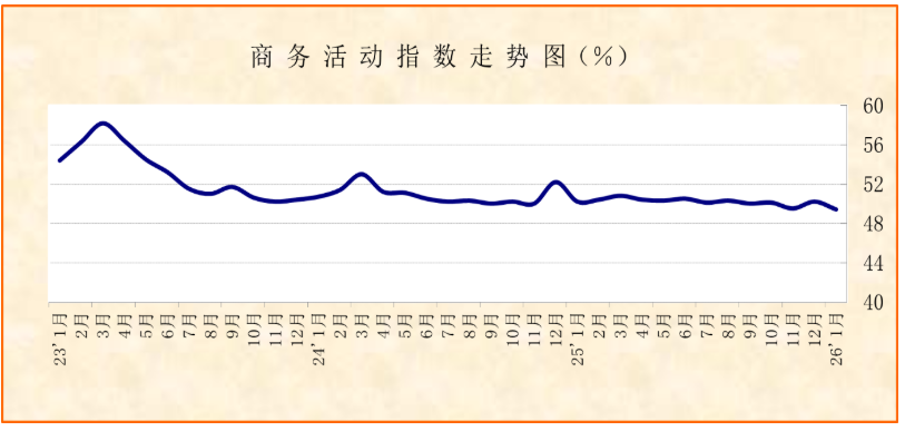 国家统计局服务业调查中心、中国物流与采购联合会发布的2026年1月份中国非制造业商务活动指数为49.4%,较上月下降0.8个百分点;新订单指数较上月下降1.2个百分点至46.1%。数据变化显示,非制造业供需两侧较上月均有放缓。分行业看,建筑业景气度下降,是导致非制造业放缓的主要因素,服务业相对稳定。