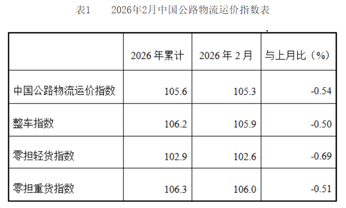 2026年2月份,由中国物流与采购联合会和林安物流集团联合调查的中国公路物流运价指数为105.3点,环比回落0.54%,同比去年回升0.46%。从月内看,第一、四周运价指数环比回落,第二、三周运价指数环比回升。