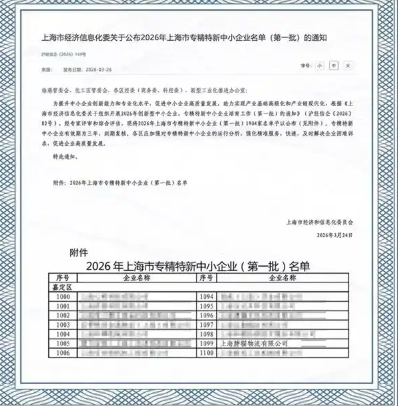 近日,上海市经济和信息化委员会发布了《2026年上海市专精特新中小企业名单(第一批)的通知》,找钢网集团旗下上海胖猫物流有限公司凭借在网络货运领域的突出表现和创新成果,成功入选。